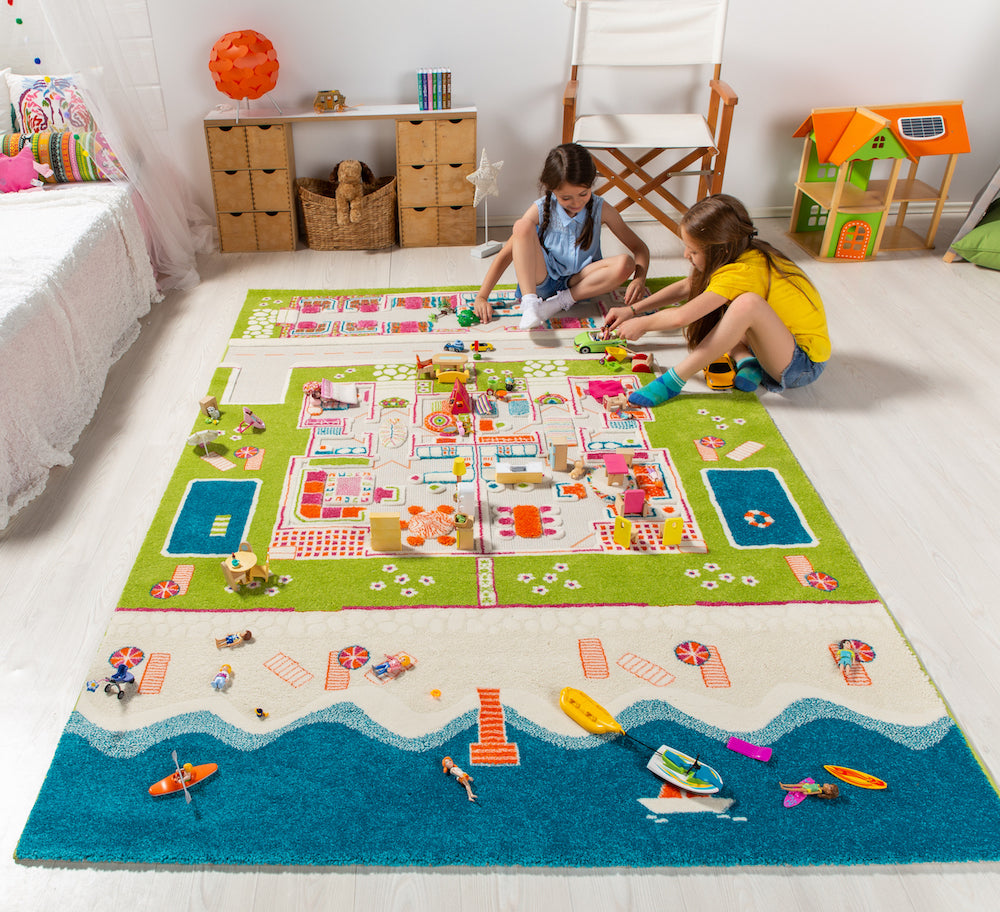 Beach House play rug will keep the kids busy for hours as they bring imaginary worlds to life. Featuring not one but two waterfront homes, your child will love playing neighbors! With raised areas defining streets and blocks, Beach House play rug is a soft, comfy center for creative play.